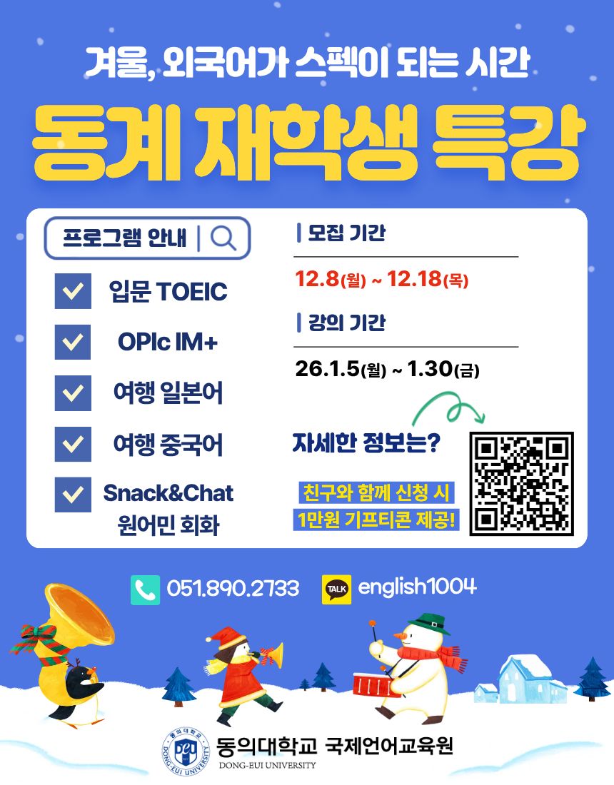 국제언어교육원에서는 2025학년도 동계 외국어 특강 수강생을 다음과 같이 모집하오니 학생들이 지원할 수 있도록 홍보하여 주시기 바랍니다.